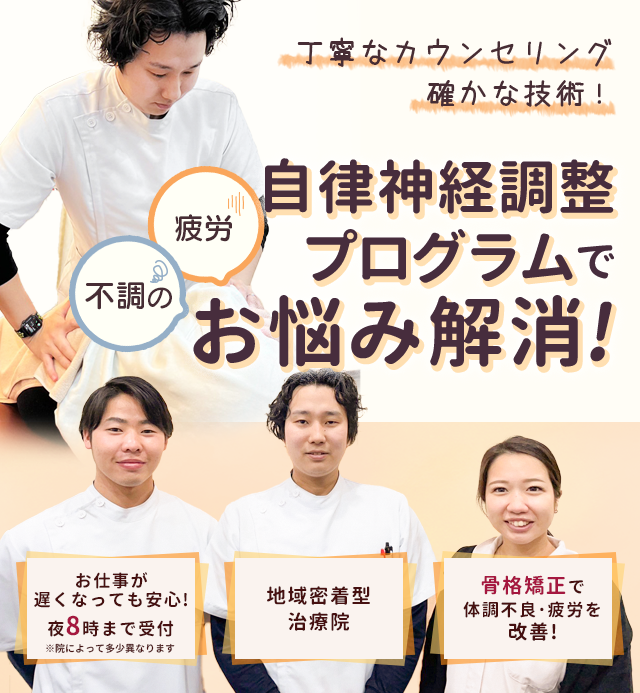 カイロプラクティックをベースにした骨格調整を行い、筋肉を本来の位置に戻るように整えていきます。また自律神経調整プログラムでは鍼灸を使用し自律神経を調整していきます。